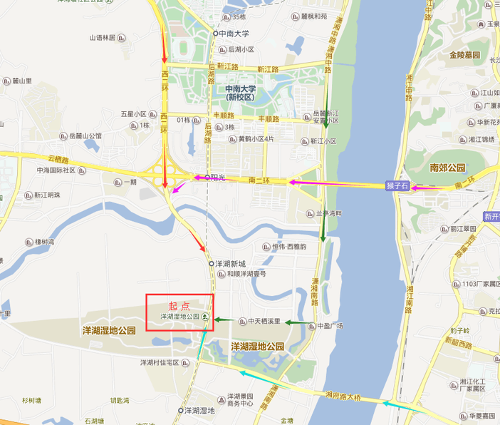的士、自驾车:可从西二环、潇湘大道、洋湖大道(湘府路大桥)三方向到达洋湖湿地公园正门先导牛广场。