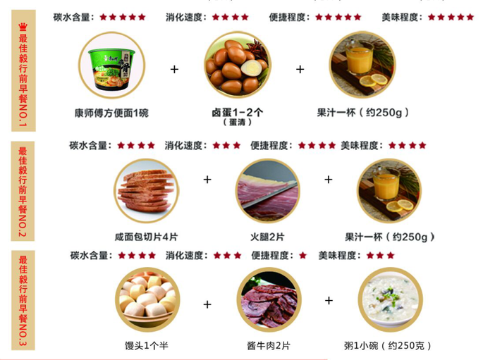 毅行膳食,是康师傅为2017湖南(秋季)百公里参与者专程研究的膳食攻略。康师傅相关工作人员表示,身体内的糖原储备量和比赛日的能量补给,是影响百公里毅行成绩的关键因素。因此,在行走之前,早餐要富含碳水化合物,才能增加糖原储备,推迟运动疲劳。最佳的毅行早餐,莫过于康师傅方便面1桶+卤蛋蛋清1~2个+果汁1杯。这样的搭配,碳水含量非常丰富,也能延缓消化速度,同时兼顾美味和便捷。