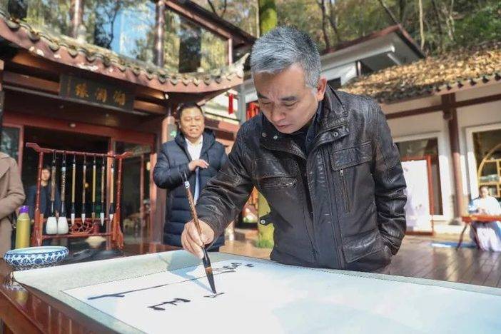 那天,让我记忆深刻的有两件事:一是从爱晚亭到能量谷的这段路车子无法进入,我们安排了电瓶车,但王老师说难得天气这么好,不如自己走上去。二是很多人拿着扇子求何立伟老师在扇子上画画,王跃文也想要,于是提出自己写一幅字互赠。
