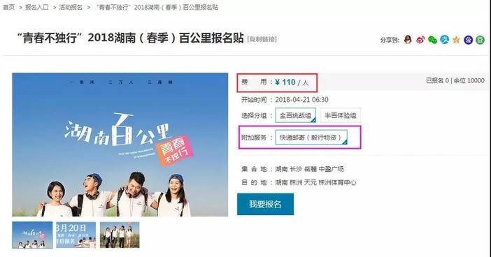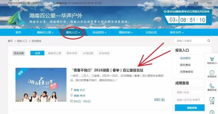 打开湖南百公里官网首页:http://www.hunan100km.com/——报名入口——活动报名——【“青春不独行”2018湖南(春季)百公里报名贴 】;