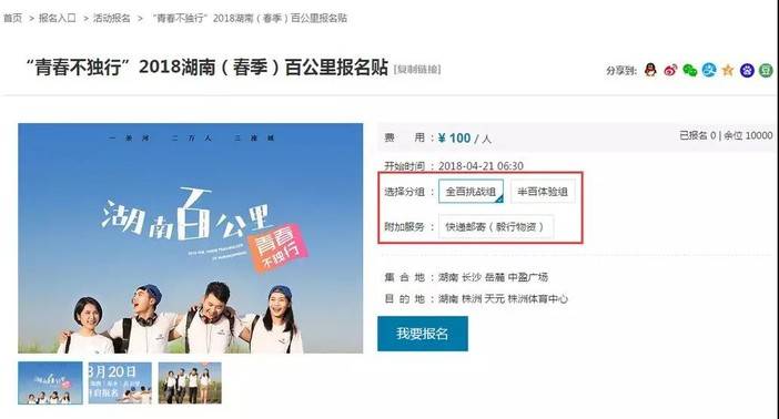 点击“我要报名”——选择分组【全百挑战组(100元/人)】或【半百体验组”(80元/人)】——省外参与者,可选择快“快递邮寄”(10元/份)毅行物资,省内参与者请在“第五步”选择线下领取;