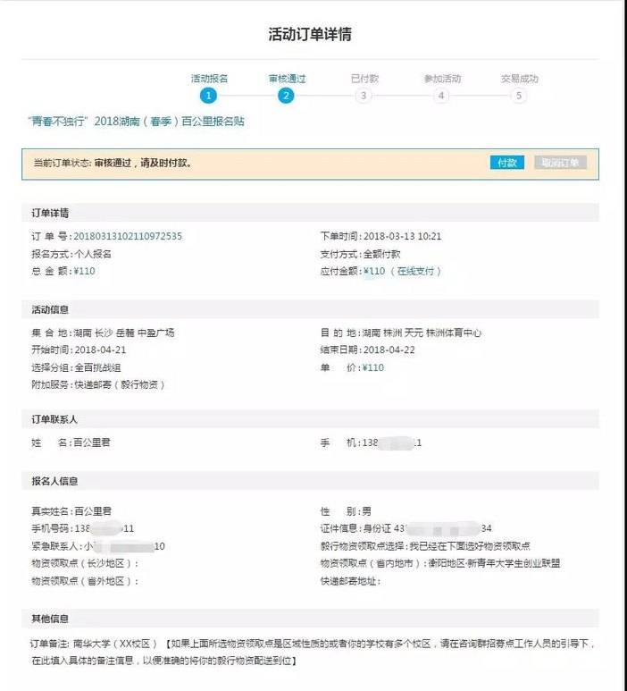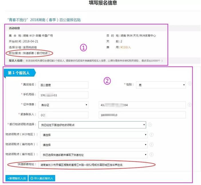 1.活动信息,仔细核对活动信息,如果前面选择了“快递邮寄”附加服务,请在“快递邮寄地址”栏详细填写您的地址,以便及时收到毅行物资。图中带红色“*”号部分为必填项;