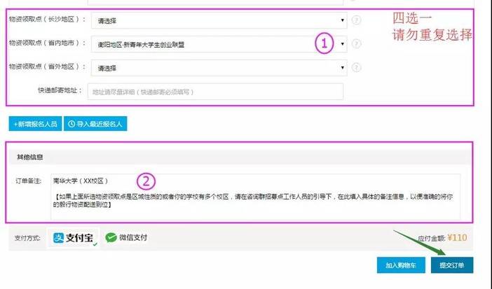 ③如果您的学校没有线下招募点,请选择一个离你最近的物资领取点,并在“订单备注”栏注明你所属校区,以便组委会准确的配送您的物资;