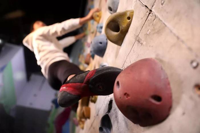 攀岩者灵巧的从一个支点攀、跳、跃到另一个指点