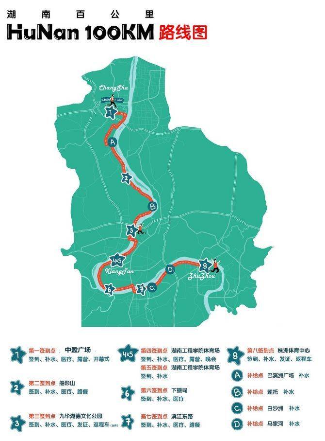 | 第八签到点 | 株洲体育中心 | 11:00—18:00 | 签到,补水,发证,返程车 | 5 | 1 | 86 | 全百终点 |