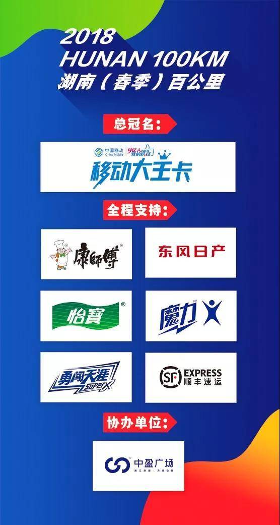 2018湖南(春季)百公里由共青团湖南省委、湖南省体育局、湖南日报社指导,由华声在线股份有限公司主办,湖南华声户外运动有限公司承办,中国移动通信集团湖南有限公司总冠名,中盈广场协办,得到了康师傅控股方便面事业湖南行销公司、华润怡宝饮料(中国)有限公司、华润雪花啤酒(湖南)有限公司、东风日产乘用车公司全境越野SUV途达、湖南顺丰速运有限公司等企业的大力支持。