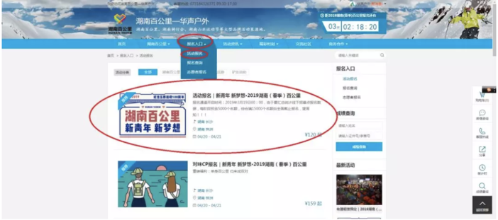 打开湖南百公里官网首页:http://www.hunan100km.com/——报名入口——活动报名——【活动报名|新青年 新梦想·2019湖南(春季)百公里 】;
