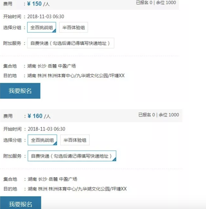选择分组【全百挑战组(150元/人)】或【半百体验组”(120元/人)】——省外参与者,可选择快“快递邮寄”(10元/份)毅行物资,省内参与者请在“第五步”选择线下领取;