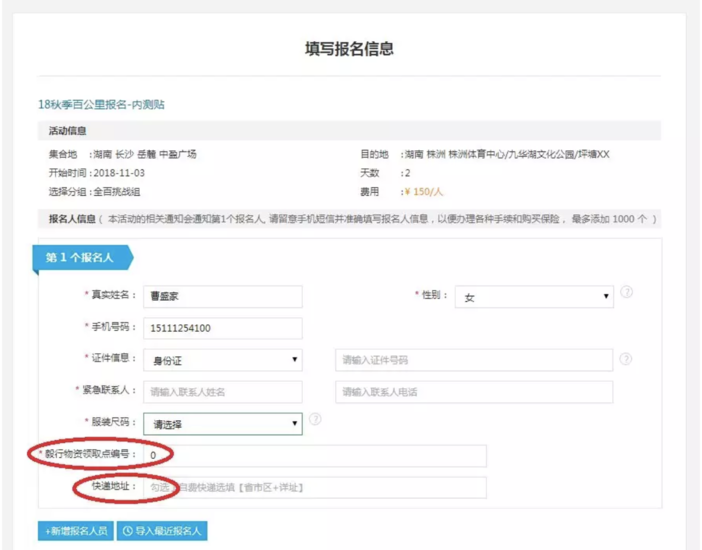 1.活动信息,仔细核对活动信息,如果前面选择了“快递邮寄”附加服务,请在毅行物资领取点编号处填0,并在“快递邮寄地址”栏详细填写您的地址,以便及时收到毅行物资。图中带红色“*”号部分为必填项;