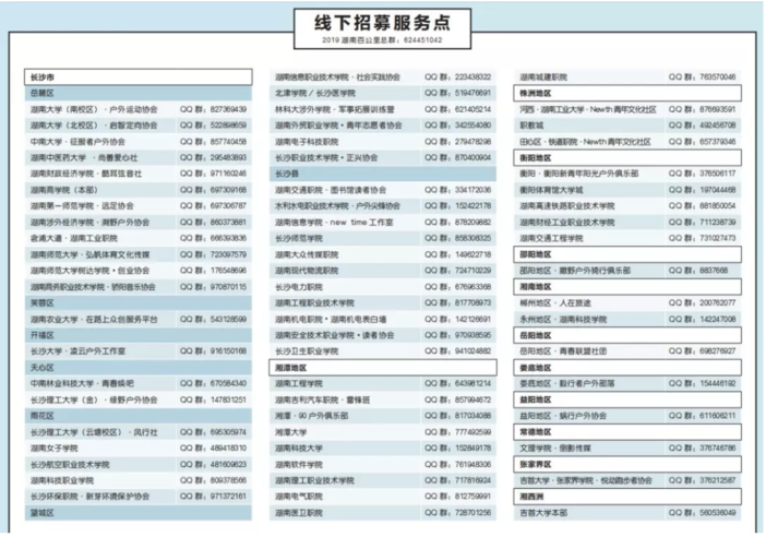 湖南百公里在全省范围内设立了70多个线下招募服务点,他们将为您提供报名咨询、后勤服务、帐篷与返程车预定等服务,请就近加入线下招募服务点百公里咨询QQ群,以便及时掌握活动信息。