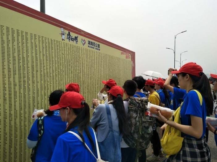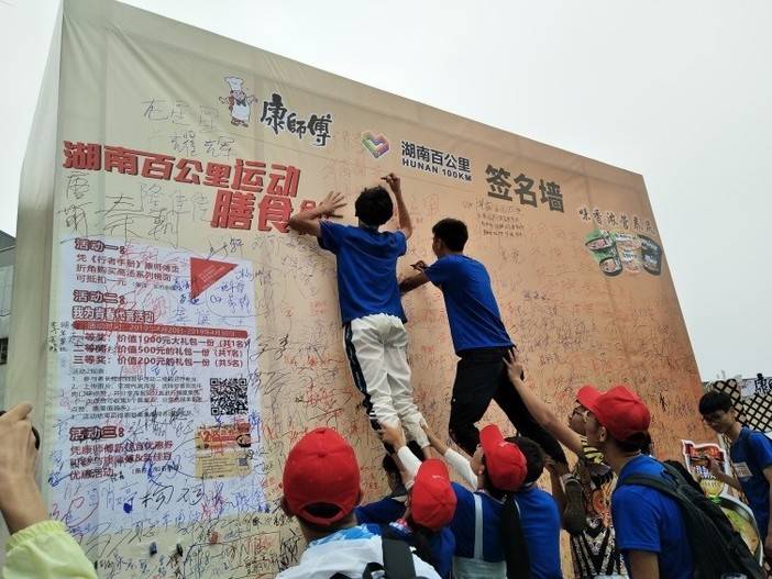 与以往不同,2019湖南(春季)百公里设立了三面签到打卡墙,见证毅行者的全程。康师傅在第二签到点设立了万人名字墙,万人名字墙是由全体毅行者名字构成。在休整点设立了46公里打卡墙,在终点设立了签名墙,都可提供于毅行者打卡纪念。