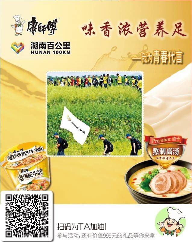 据了解,作为中国方便面企业的代表者、方便面领军品牌,康师傅已经连续5次为湖南百公里提供全程营养膳食服务。康师傅在这几年里,不断升华品牌价值,传播健康美味的理念,为毅行者们的营养膳食保驾护航,让毅行者以最好的状态走完全程,遇见更美好的自己!