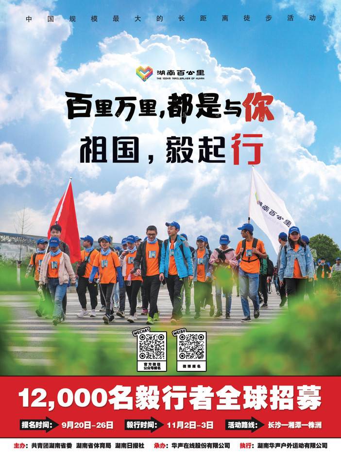 湖南百公里是中国规模最大的长距离徒步活动,更是湖南省最知名的全民健身品牌之一。2019湖南(秋季)百公里活动由共青团湖南省委、湖南省体育局、湖南日报社共同主办,华声在线股份有限公司承办,湖南华声户外运动有限公司全程运营执行。