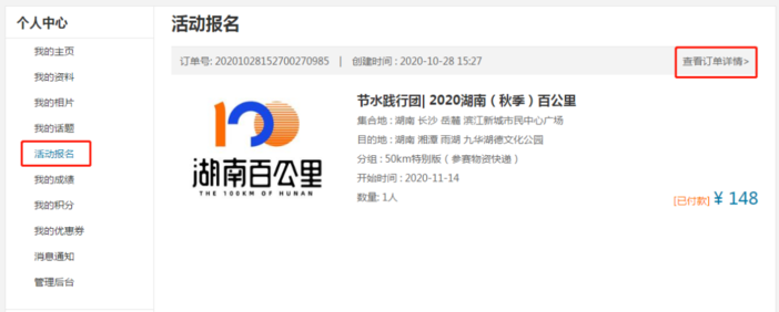 2、如确认无误的话,可再进入【个人中心】→【活动订单】→【订单详情】查看报名详情,确认报名时填写的姓名、证件号是否正确。部分小伙伴可能报名时因填写不规范,导致信息填写有误,以致无法查询。