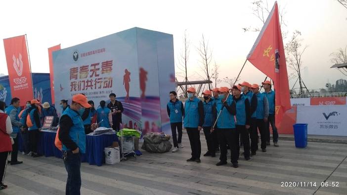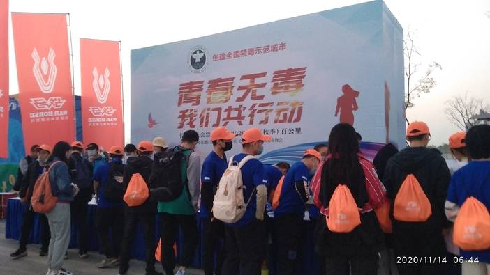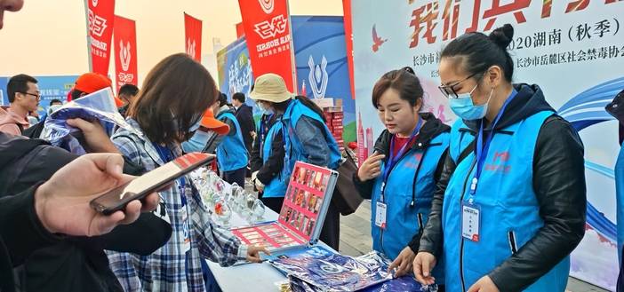 2020年11月14日,长沙市岳麓区禁毒委员会办公室、长沙市岳麓区社会禁毒协会协同“2020湖南(秋季)百公里活动”共青团湖南省委、湖南省体育局、湖南日报等主办方在“百公里活动”现场开展“青春无毒、我们共行动”禁毒宣传活动。活动旨在进一步加强在青少年群体开展禁毒宣传,普及禁毒知识、促进青少年和高校学生、白领及企业员工身心健康,提高全民禁毒意识、营造全民参与和支持禁毒工作的浓厚氛围。活动在沿途设置各种宣传展板、禁毒签名墙、刀旗,活动现场以展示仿真毒品模型,工作人员讲解各类毒品知识,发放禁毒知识宣传手册、宣传单页、以及印有“青春无毒、我们共行动”的宣传背包,有奖问答等多种形式开展,引导毅行者关注“岳麓禁毒”视频号、抖音号。通过广宣传、广发动,使得参与此次“百公里活动”的各大高校学生、白领及企业团队基本达到人手一份禁毒知识宣传手册或宣传单页,10000份禁毒知识宣传手册、宣传单页一早就随着参赛包送达到各位参赛毅行者手中。