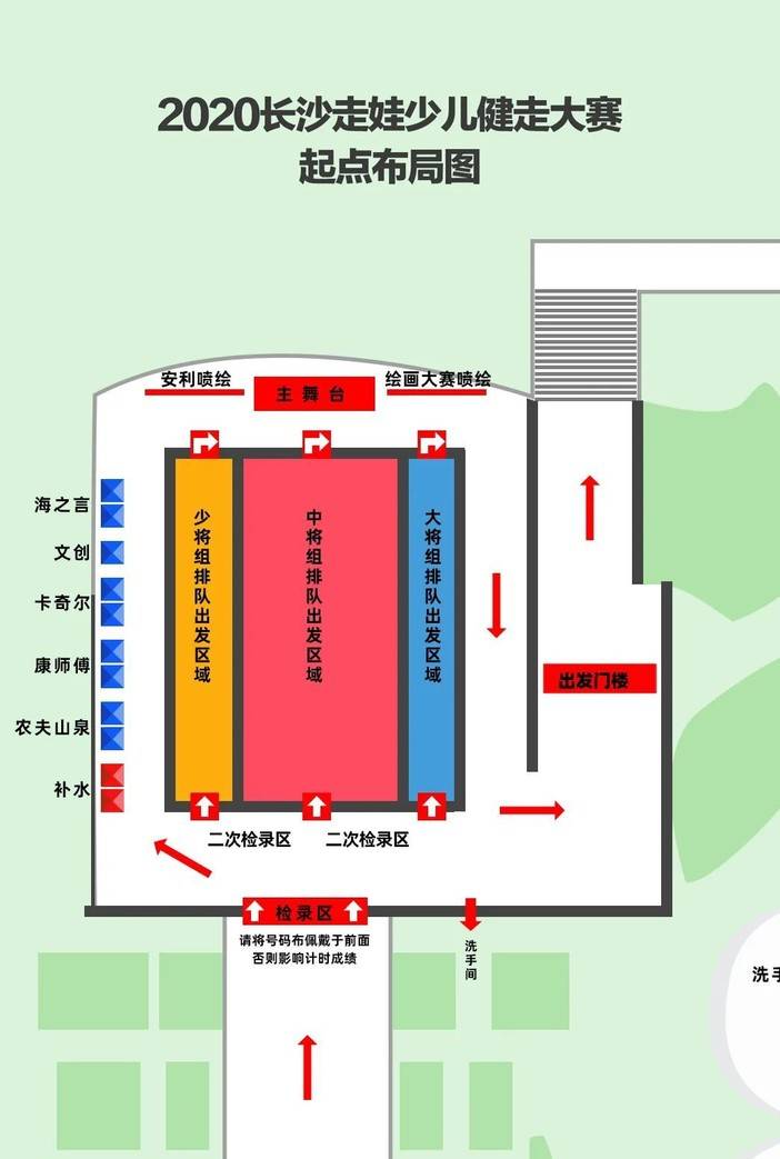 此图为起点布局图,请在11月29日早上7:00—8:00身着参赛服到达起点滨江新城市民中心广场(湖南金融中心金融广场),将号码布佩戴于胸前进入检录区检录,本届走娃起点为封闭式管理,共含有两次检录,更多详情请仔细阅读上方起点布局图。