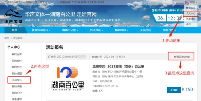 4.如果以上情况都不属于,可进入官网,点击“个人中心”,在左边列表找到“活动报名”,点击“查看订单详情”【手机版点击“订单号”】,确认自己的报名信息。