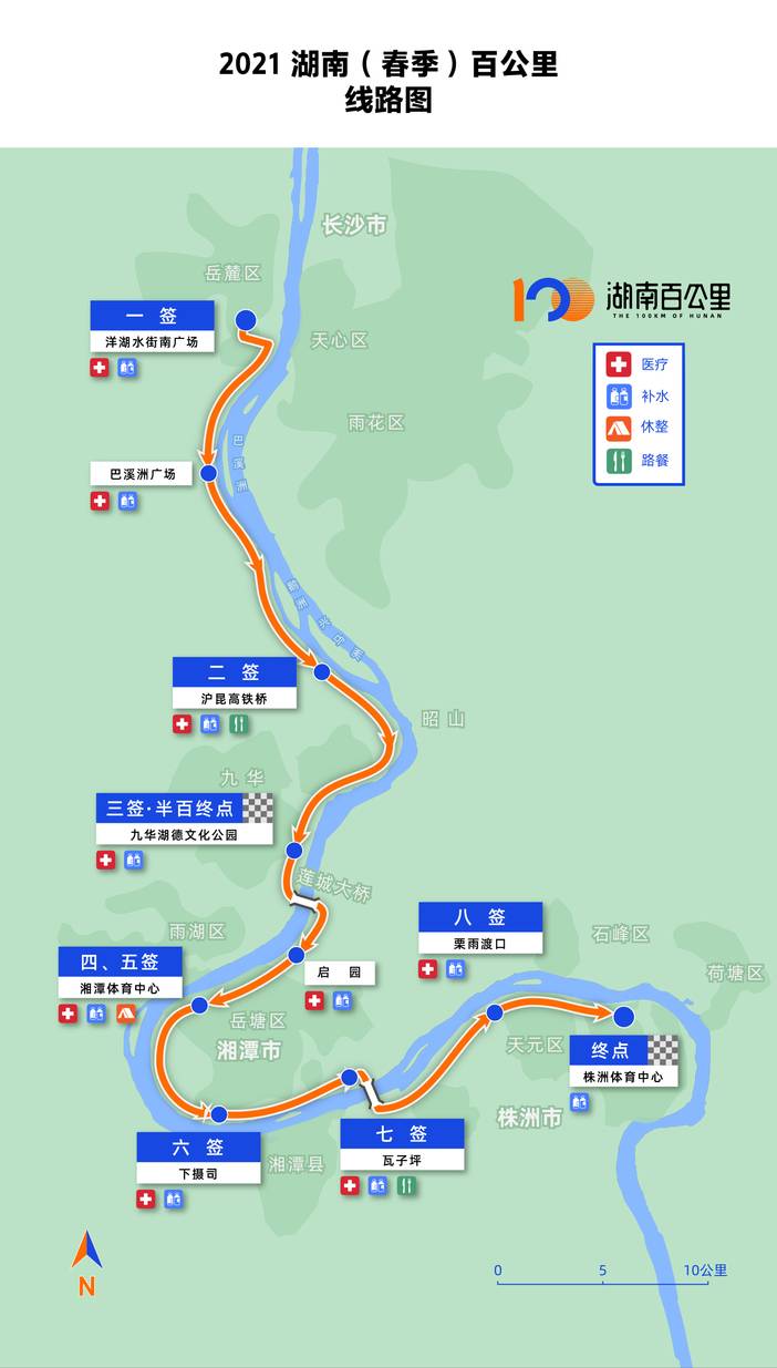 | 第三签到点(半百终点) | 湘潭九华湖德文化公园 | 9:30—16:30 | 签到,补水,饮料补给,医疗,发证,返程车(自费) | 32KM |