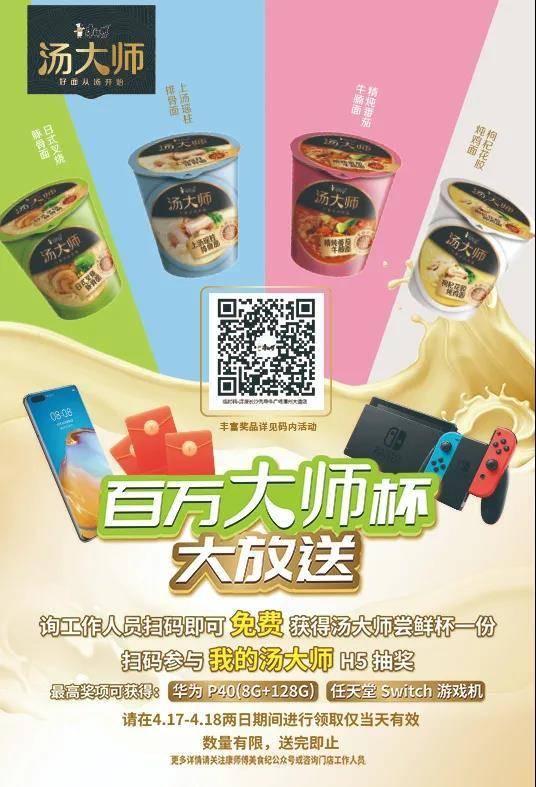 康师傅百万大师杯福利大放送!活动现场扫码可免费领取康师傅汤大师尝鲜杯哦~