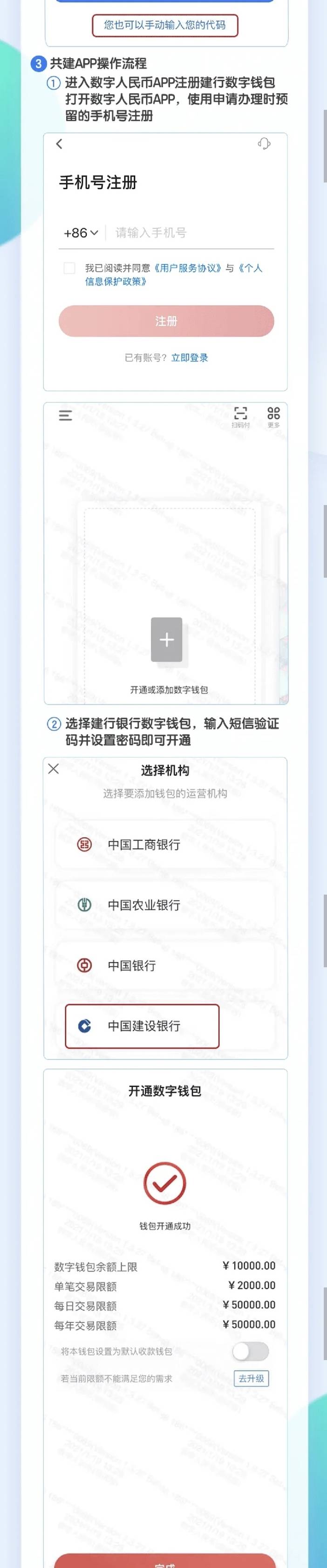 步骤2,下载完成之后,我们再打开下载好的央行数字货币app,进行注册登录以及建行钱包的添加。添加建行钱包的流程为点击注册数字人民币账号,输入手机号点击注册。填写完验证码后,设置登陆密码后,点击开通/添加钱包,选择中国建设银行,输入短信验证码并设置支付密码后,即可成功开通。