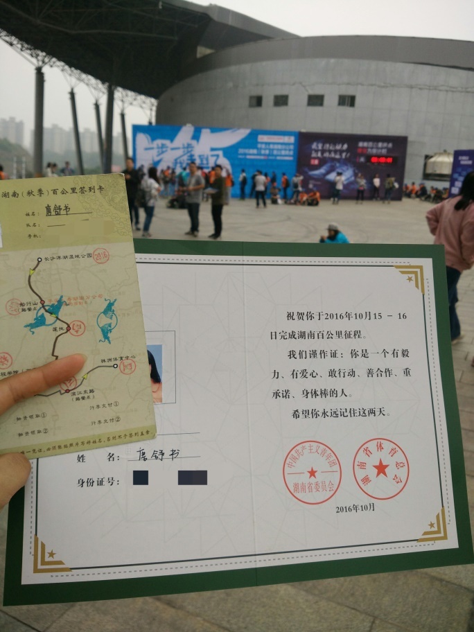 然后,终于在下午三点半抵达终点——株洲体育馆。拿到毅行证书的那一刻,感觉一切都值得了,两日踏三城的气魄,我们也拥有。脚底的水泡不算什么,吞的止痛药不算什么,流过的汗受过的苦都不算什么。其实我们每个人,都比自己想象中强很多。