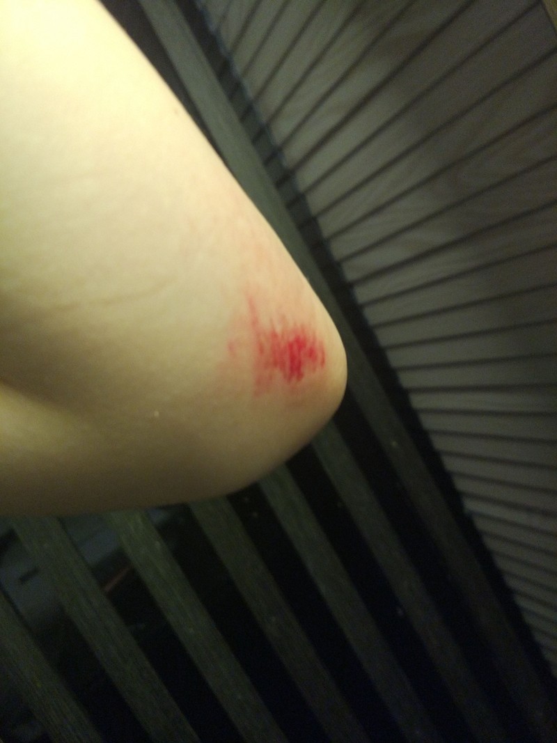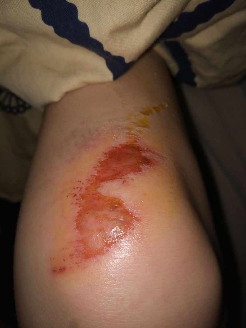 不知为何,我竟开始柔弱娇气起来,打电话给男友哭诉了一通我的“惨痛”遭遇后,我仍然有点慌乱失神,愣愣地坐在那里。直到小伙伴们排到我了,医护人员开始帮我处理伤口,从膝盖处的伤口、手臂上的伤口到腰上的伤口,我仅仅抓住小伙伴的手,目睹着这血肉模糊的伤口被碘酒一点点地沾湿,我隐忍着不发出声音,眼泪却不禁地无声掉落,小伙伴们心疼的望着我,待处理完伤口后,已经快九点,小伙伴们帮我拿背包,搀扶着我去打车回酒店,回到酒店已经快十点,小伙伴们张罗着去药店买药给我,奈何太晚了药店都没开门,我们在酒店前台处装了一杯碘伏,便回房间休息了。