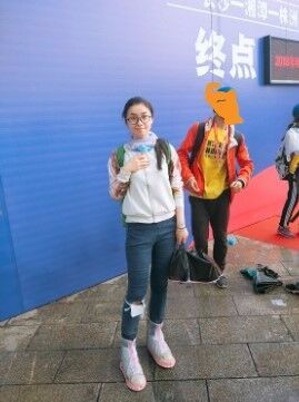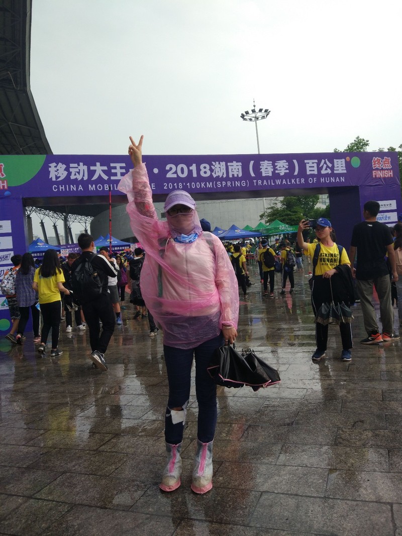一路上风雨萧条,我在人群中倔强地步履蹒跚地往前走,我不知道前方是哪里,还有多远,还需要多久,我只是一直往前走,路上叫卖的小贩,坐在路边休息的人儿,和这淅淅沥沥的雨声,似乎和我都没什么关系,penny的歌单循环了一遍又一遍,”对自己残忍 多残忍 我要有分寸 我太过认真 所以才相信所谓的永恒 我只是无辜的人 很需要叹气声 有一些文字的吻 只留给伤过的人 明知道有些问题 没有答案还是要问 原谅我 因为我就是 这样的女生 ”。在路上我也曾遇到过好心的小哥哥,在看到我纱布脱落的伤口后皱眉问我需不需要他的搀扶,在路上我也曾遇到过怕我伤口感染劝我打车的路人,这些来自陌生人的问候在此时让我感到暖意满满,平凡的问候在这种情况下显得熠熠生辉,我想这次百公里毅行,除了友情的伤痛外还有这些路人的温暖也是我所久久不能忘怀的吧。在最后一段路上,电闪雷鸣,狂风暴雨,我膝盖上纱布不争气地裂开了,伤口沾了雨水后更是通过疼痛来反抗,我撑着伞,慢慢地走,直到我看到了株洲城轨的轨道,我就知道我离终点不再遥远。如果你在这次百公里毅行里看到了一个穿着粉色雨衣,戴着紫色遮阳帽,撑着蓝色雨伞,膝盖有一处触目惊心的伤口,走路一瘸一拐的女生,那个人就是我。在路上试图帮助我的人,我在这里谢谢你们,虽然不知道你们是谁,愿好人一生平安。
