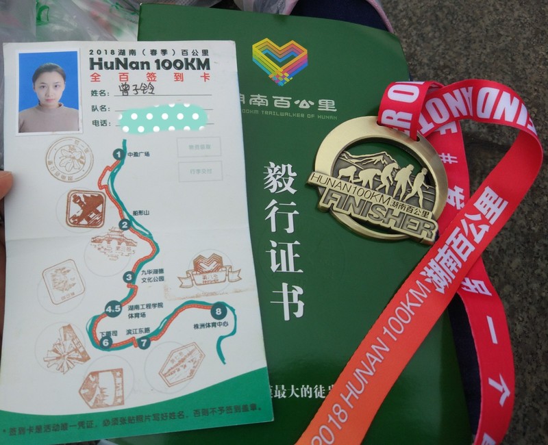 在距离终点10km的地方,我得知她们在终点处等我,等着我一起回学校,我知道在终点处有人在等我,这是一种信念,仿佛淋雨的伤口和之前肝肠寸断的心痛都只是过眼云烟,明明身体很疲惫,在最后一段路我却是越走越快,伤口的痛感已经麻木,我完全不想在路边歇息,一刻也不愿意,我一步一步地奔向终点,当我看到株洲体育中心的轮廓时,眼眶湿润,泪眼朦胧中我看到了“2018湖南(春季)百公里终点”,我顿时感觉这路上所遭受的一切都值得了,我拿到了湖南百公里毅行的证书和奖牌,去年的这个时候,我也是在这里拿到了湖南百公里毅行的证书,我感慨万分。最后我看到了明明早上还一起出发却似乎如隔三秋的她,她看到我的瞬间眼眶湿润,拥抱了我,心中的辛酸苦楚瞬间在我心中翻云覆雨,所幸,我们最后还是破镜重圆了。