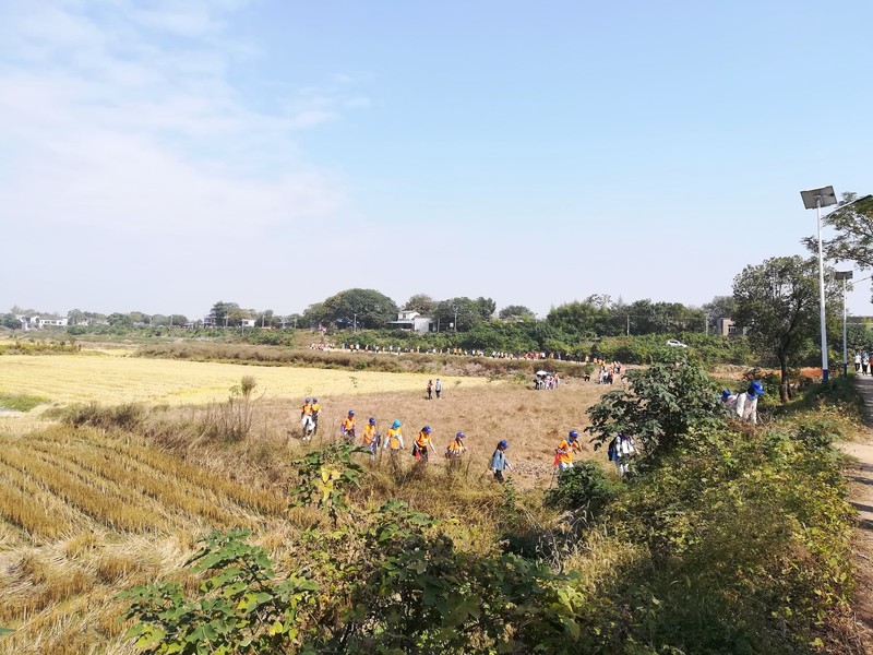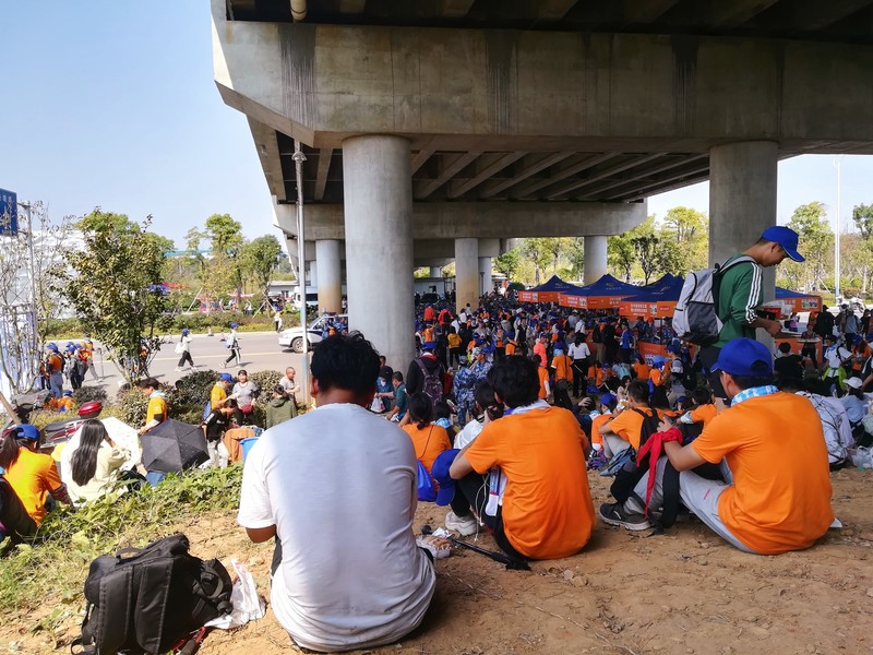 一夜无眠。第二天早上临时发生了一点小变故,我和同伴最后两个出发的。大部队已经没影了,找不着路了,当时心情别提有多糟了,感谢当地卖早餐的大爷们+红色醒目的毅行路标,让我赶上了大部队的尾巴。终于赶上了你,还好我没放弃。尽管追上了橙色队伍,但还是担心八点半出发的我们能否完成今天的里程。于是我们用竞走的方式超过了一个又一个的毅行朋友。长时间竞走总归会有肌肉酸痛的时候,还没等我们走到19KM第二签到点,我们速度就慢下来了,这期间,我们走了很长一段的黄土石子路,每有车子驶过,掀起一波尘土,我们纷纷戴上口罩或头巾。同伴兴致盎然地和我分享着各种学校新鲜事,而我,在期盼着能看见厕所,因为此刻我的肚子一阵一阵翻涌,此刻只有上厕所能使我开心,这一石子路何时是个头啊?终于在土路的尽头,有了平坦的水泥路,补过水,终于看见厕所了,像在发光般,虽然队伍很长,但慢慢等总会到的,权当休息一会儿。不久,我们又走过了很长的一段水泥路,这一路我们聊了很多,但更多的是走这一路的经验,明天不能背太多东西,带瓶水,带点纸、干粮、手机、签到卡就够了。中午十二点,我们到了第二签到点。广场上四处席地坐满了人,大多数人脸上写满了疲惫,但又透出一丝不服气,对下午的里程斗志满满。当志愿者接过签到卡,盖章递给我的时候,微笑地对我说加油!此刻成就感爆棚,我会走到一个一个签到点,盖一个又一个的章,直到终点。吃了一包面包,期间又排了很长的队上了一个厕所,才感觉肚子舒服一点。一点钟,我们又出发了。路上我们经过了一个小镇,乡间的小路时而宽敞,时而狭窄,两旁或是平房,或是漫天杂草,也有参天古树,当地居民微笑示人,各安其乐。走完这个小镇,宽阔的道路上工整地摆了两列车,一直延伸到很远很远,没有尽头。事实上,我们参观了一个半小时的车展,同伴笑道,这够我们吹一小时的牛逼了。这一路上,路面上都很干净,没见有什么垃圾,有垃圾桶的地方就堆成山了。飞速驰过的高铁桥下,我们踏着缓慢而坚定的队伍前进,似乎在昭告我们用行动保护环境的决心。这一路上,虽然有很多人停下脚步休息,但都以更坚强的决心起身前进。坚持下来,就没有什么好犹豫的。偶尔,我和同伴会感觉到对方慢下来的频率,但我们都没有停下来的意思,我们约定好了,走一个小时休息十分钟。要不然,很难在八点前走到休整点工程学院。我的小脚趾好像起了水泡,脚板也痛起来了,最痛的是大脚趾甲,但所幸我的毅力还是满格的。同伴的情况跟我差不多。送去下一签到点的司机师傅走不远就能看见一个,“小姑娘,要不要我送你们一程?十块钱一个,下一签到点还有很远的”,“不了,慢慢走总会到的”我笑着回道。如果我坐车代替走路的话,那我这次活动还有什么意义呢?既然知道一定会到的地方,如果快一点到达的代价是作弊欺骗自己,那我宁愿晚一点。下午四点半,我们到了湖德文化公园签到点。接过盖了章的签到卡和奖励的功能饮料,我感觉到别人对自己的认可,对自己拒绝帮助坚持走完的认可。还有今天的最后十公里,出发!日暮西沉,天色变暗,这十公里走的是越来越困难,越来越慢。身体极度疲乏,脚像灌了铅一样,走一会儿就想休息,已经不顾满地的土,就这么坐下,一步也不想走了,但看着身边的人一丛一丛地过去,他们也是疲惫至极,同伴跟我鼓气,36公里都走过来了,这也就10公里,再坚持一会,结果肯定大不一样。我起身,这回是更酸痛了,今晚一定要好好休息一下在这之前,啥也不想,就跟着他们走,终于,在手机地图上一点一点地离签到点近了。穿过马路的时候,远远的司机就停下来,为我们让路,瞬时我仿佛充满了力量,和同伴的步伐不自觉地加快了些。很快,我们就到了休整点,湖南工程学院,这时,天已经全黑了。这张签到卡被水浸湿过,现在皱巴巴的,我紧紧地捏着,它见证着我们这一路的辛苦历程。