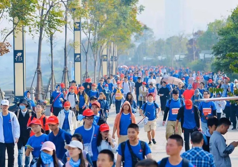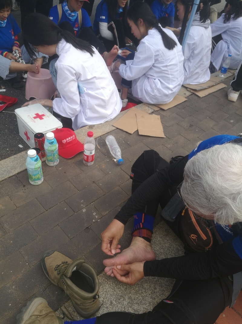 开始走着还是很起劲,一万多人一起同行,满壮观的,十公里一个签到点,到了第一个签到点时,有点饿了,脚底已经疼起来了,路边的厕所永远都是排着长队,团队中的队员已经开始有脚上起泡的了,医疗点开始排起了长队,都是脚上起泡,到了第二签到点有人已经开始蹲在地上起不来了,听到有人抱怨了……