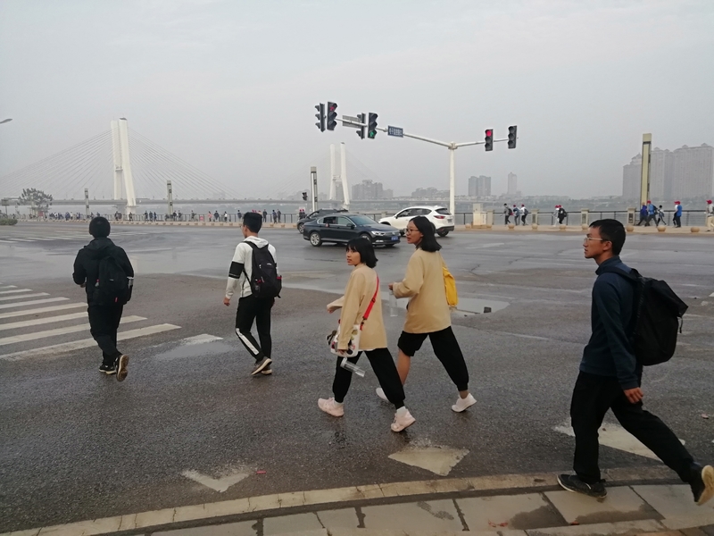 第二天的行程同样是走走走,和上次一样。走过湘江风光带然后转入沿江的石子路。我们一群人在湘江风光带上的湘潭之星塑像前合了影,还趁着有活力一起跳起来拍了动态照片。在转入石子入时还领到了翻天娃的辣条,累的时候吃一包真的很精神爽快。那条石子路简直就永远没有尽头,感觉双腿就像灌了铅一样,每挥动一下都要用尽全身力气,双脚都起了水泡还不小心碰破了,每一步都是痛苦的,那么长的石子路也让我有些绝望。不自觉的放慢脚步、一瘸一拐的向前走,也索性就让他们不要再等我了,一路上自己行走。遇见了形形色色的人,跟不少小伙伴都聊起天来,路上还目睹党旗和百公里活动旗的前进,致以崇高敬意。