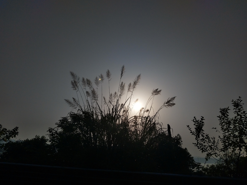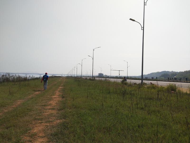 上午是一段很轻松惬意的时光,因为都是沿着江边的小道而行,再加上刚刚开始行走,精力满满。我们一路上互相打趣着一边欣赏着江边的风景,倒也惬意。最爱的是那一段江边小道,江水仿佛就在咫尺之间。江面波光粼粼,浪花翻卷,时不时驶过的一艘小船和江边休闲垂钓的老人们,再加上道路旁不时摇荡着的一丛丛芦苇,这一切在阳光的映衬下,似一幅无比美丽的画卷。我醉了,就这样赏着美景走着,很快的过了第一个补水点,又过了二签。
