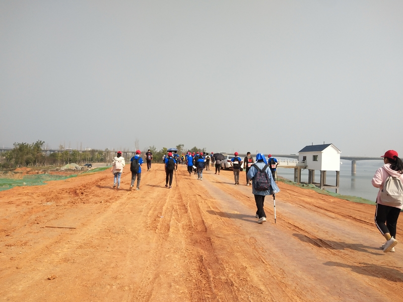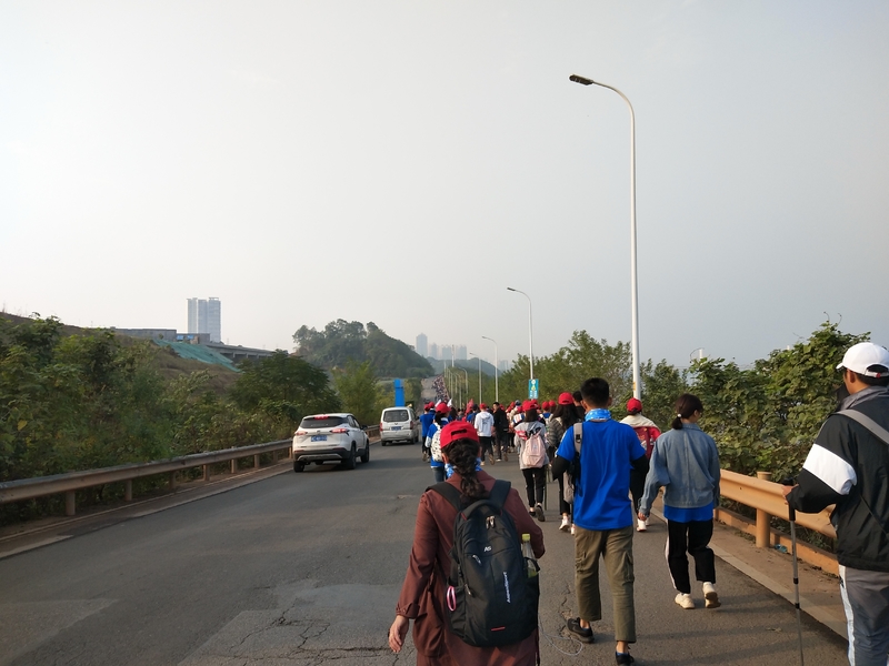 第二天迷迷糊糊起床收拾帐篷托运行李之后出发了,我惊讶的发现我们被甩在了队伍的末端?!不服输的心让我们不停地赶超着前面的人,于是一路加速加速加速!9点经过了湖南工程学院,发现原来今天的路程要相比春季更多一点,可我腿这个状态,实在难说这次什么时候能到达终点,走着走着腿又慢慢变得沉重,有一股莫名的邪火在心里燃起,自己的内心不断催促自己全速前进。签了第六签,心里不停的想着继续加快步伐!但……残酷的现实告诉我我不能。走上那段死亡石子路,我感觉世界都黑暗了——望不到尽头的,还是走一步就不时硌着脚上水泡的石子路!!相信这一段路让不少人感受到了安徒生童话里小美人鱼的痛苦,我也只得将自己变成了一个没有感情的走路机器,整个人机械的挪动着聊,步伐越来越沉重,速度越来越慢……12:45分,历时三个小时,这漫长又煎熬的石子路终于被征服了!我却感觉走了一个世纪!