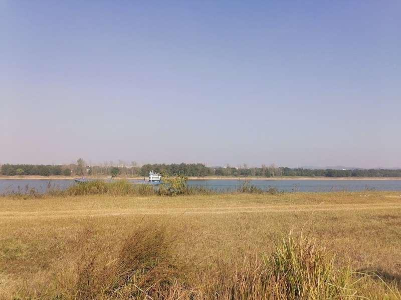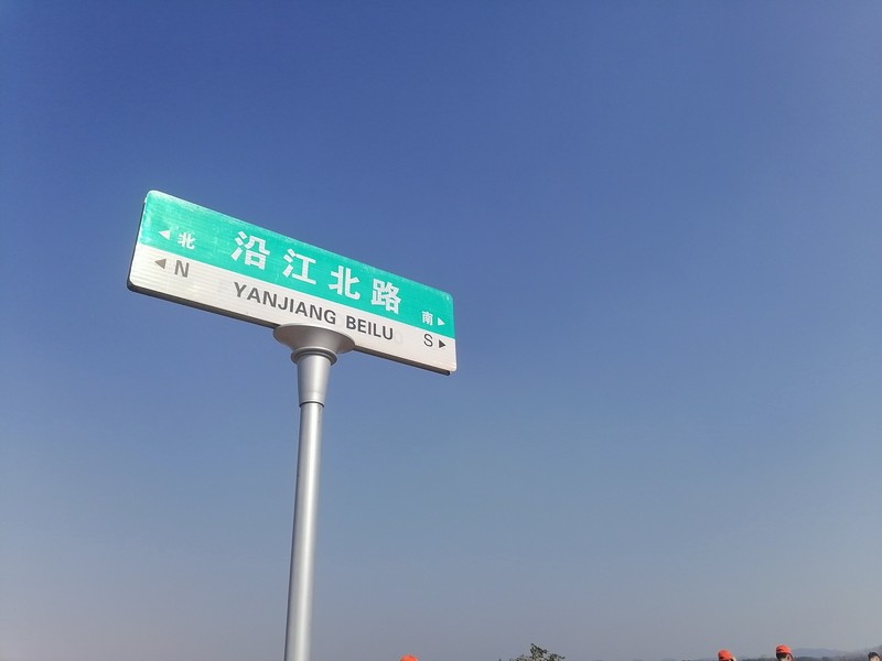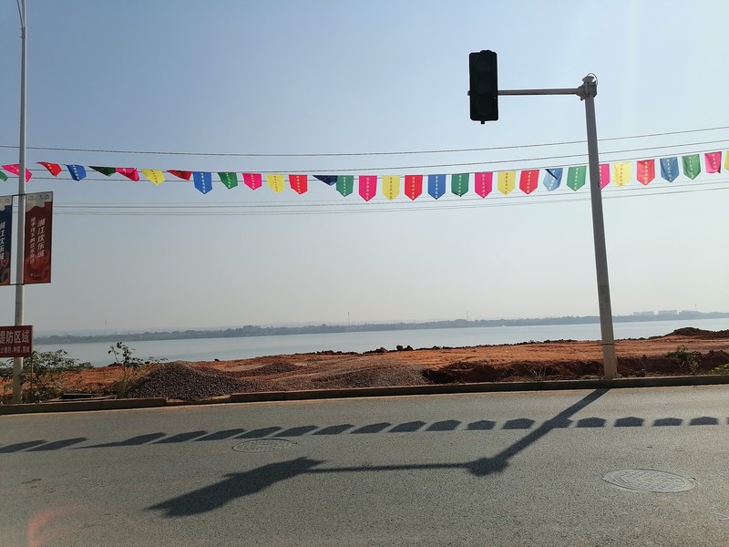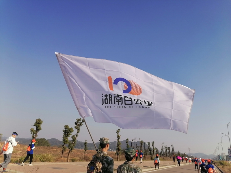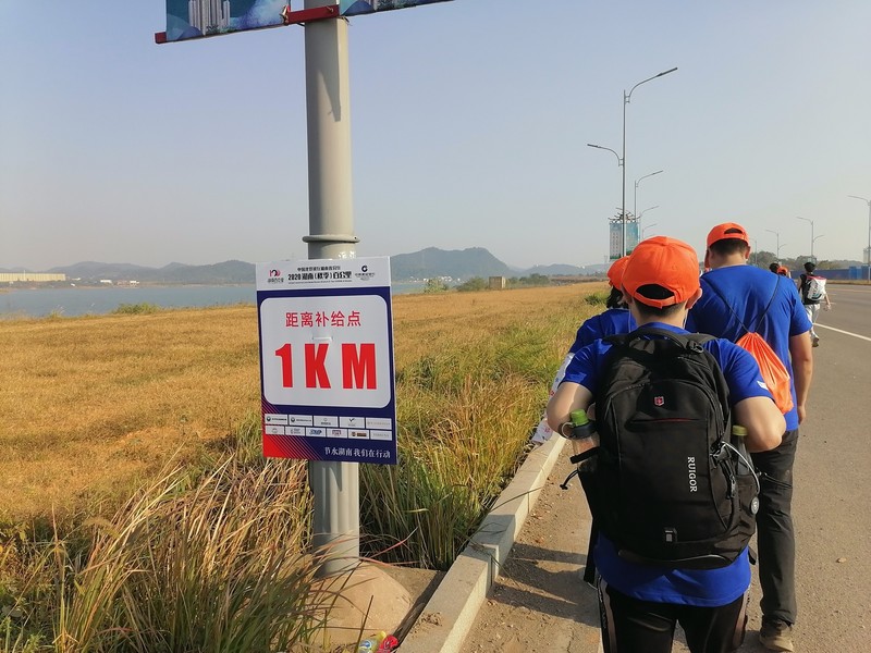 到了第二补水点后,稍作停留我们便继续向前,因为我们已经落后很多了。这时身边的景象不再是黄沙了,而是一条挨着湘江的大马路。道路上坡又下坡,一眼看不到头,跟着大队伍一直走着,已经没有力气和姐姐说话了,只是时不时的问一句:“要喝水吗?”大家的距离也慢慢拉开,都慢慢走着最后10km。当我们的速度一点点的慢下来时,头顶出现了一面旗子,原来是身后的军人哥哥和军人姐姐快步追上我们了,心里不禁对他们肃然起敬:和我们一同开始的他们依然坚持着,而我们已经开始“萎”了,真不应该!飘扬的旗帜!鼓励我们坚持!(这也是我很喜欢的一张照片!)