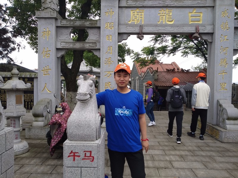 从起点继续向前走,到补水点只有九公里但速度也稳定下来了,有景点或是没见过的东西或精彩的人都记录下来,途中来到了一个白龙庙,有十二生肖的景观,我倚着午马的雕像找人拍了张,继续上路,中途和另外五人走散了,后来才知道超过我了,最前面男女同学都姓李,他们俩走着走着就跑起来了,非人哉。路上的标语很厉害,直接到我们心里去了,比如(下方图片)