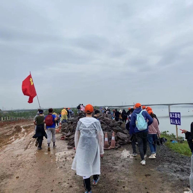 时间来到百公里当天,当众人随着挥舞的党旗国旗迈出第一步,属于我一个人的长征也开始了。开始总是简单的,尤其是混迹在人群之中,周边的人都充满了欢声笑语,走动起来更加显得轻松,这时候还有闲心看看周围的鸟语花香。到了下午半百终点之后,泥泞的道路明显开始难走起来,身边原来的熙熙攘攘也逐渐变成了三五成群,此时,心里完全已经开始防空,偶尔调整下背包的姿势,也只是为了让身体能舒服一点,双腿早已麻木,撑着拐杖,只想着,再走一公里,再走一公里就休息;过了这座桥就好,到那一头再坐一会。就这样,在不停地自我安慰之下,在暮色中走到了湘潭体育中心。