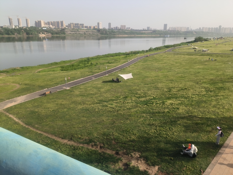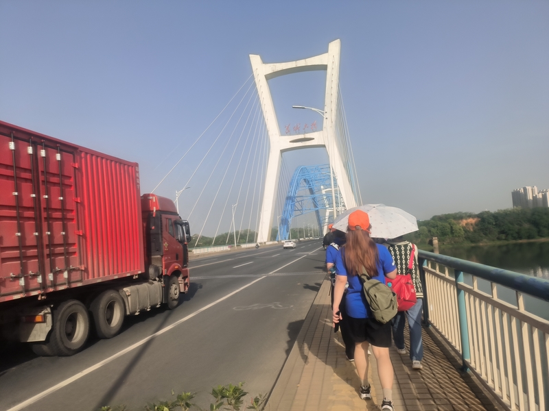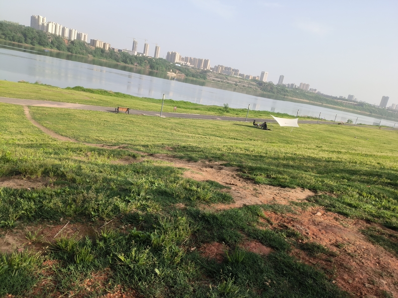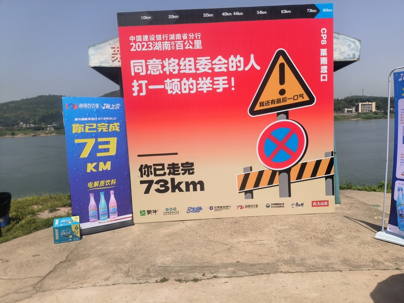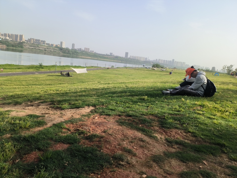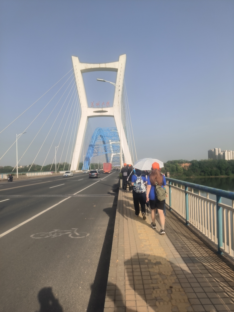 20里过后,温度升高,疲惫感也无法防备的爬到了身与心,三个同行者相互抱怨,缓解掉心中的烦闷,也相互照应,更是相互陪伴,不至于心气逸散,掉了队。到了中途的注意区之后,领了主办方提供的牛奶面包,就找了块草地修整了,队伍里有音响,听着歌,乘着凉,看着湘江的悠悠水流,好不惬意。也是特别防范了惬意冲淡了行走的意志,适当休息后,状态恢复,马上便是迈向了下一个签到地点。就边际效应来讲,累的更快了,路上交流少了,喘气抱怨多了一些,三五公里,就看到有许多人找了块阴处乘凉休整,我们仨呢,也是走走停停,不过却很少会休息很长时间,往往是三五分钟便重新上路。